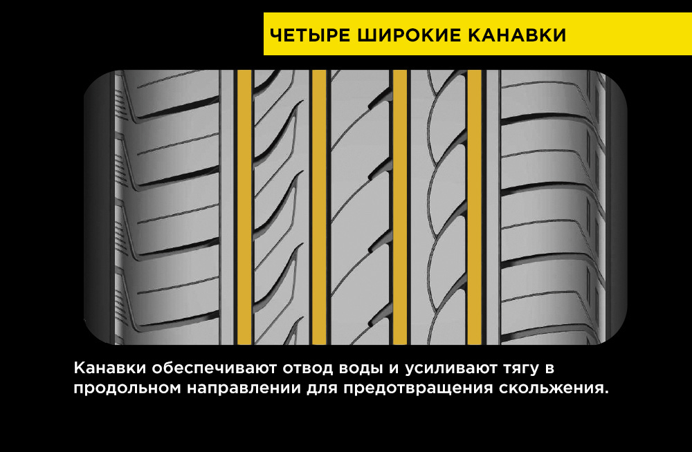 Протектор разделен на пять функциональных зон для улучшения сцепление на сухой дороге и динамики на мокрых покрытиях. Большое количество глубоких дренажных дорожек и более мелких извилистых ламелей плечевой зоны способствуют отводу воды из области контакта протектора с дорогой. Реализуемая таким образом функция самоочистки надёжно защищает от эффекта аквапланирования, благодаря чему поездки в дождливую погоду становятся безопасными.